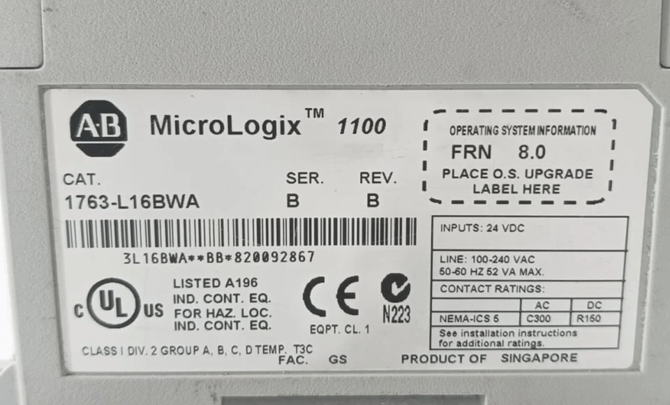 Allen Bradley 1763-L16BWA Micrologix 1100 PLC SER.B Product of Singapore.