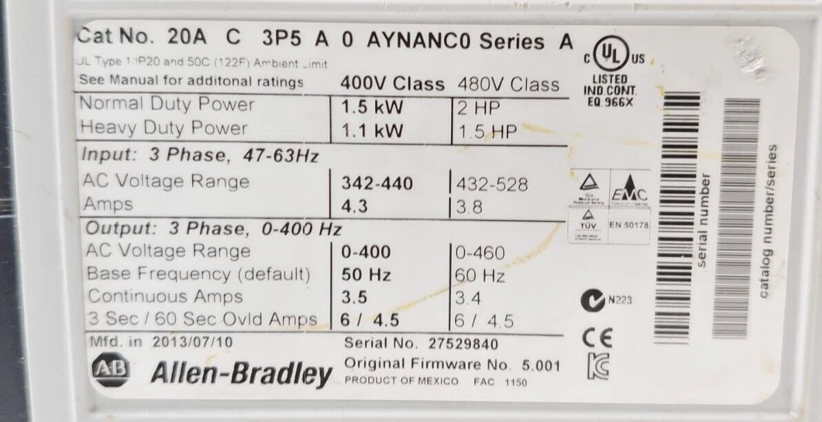 Allen Bradley 20AC3P5A0AYNANC0 Power flex70 Ac Drive 2HP